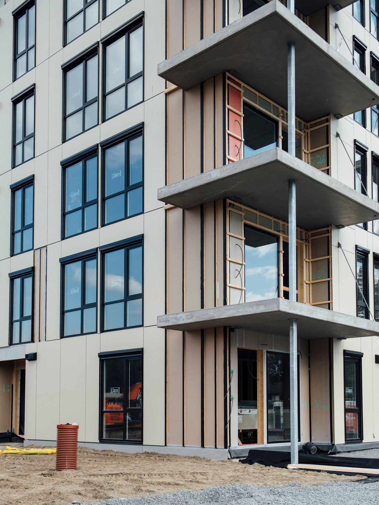 Prefabrikkerte betongelementer sikrer rask montasje og minimerer behov for stillas og øvrig arbeid på byggeplass. I tillegg reduserer det mengde avfall i prosjektet. God prosjektering og prosjektstyring har sikret effektiv fremgang i prosjektet og leveransen på Hønefoss.